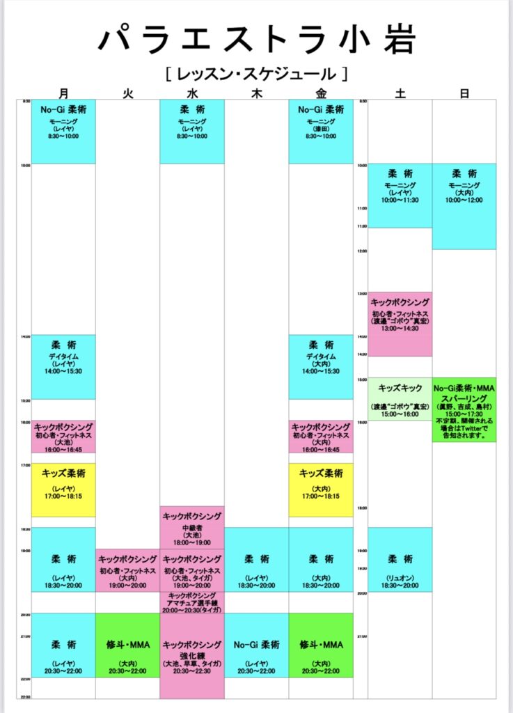 他主な変更点は、小岩月曜の昼柔術、キッズ柔術の担当がレイヤ先生にキック初心者が大池先生に代わります。