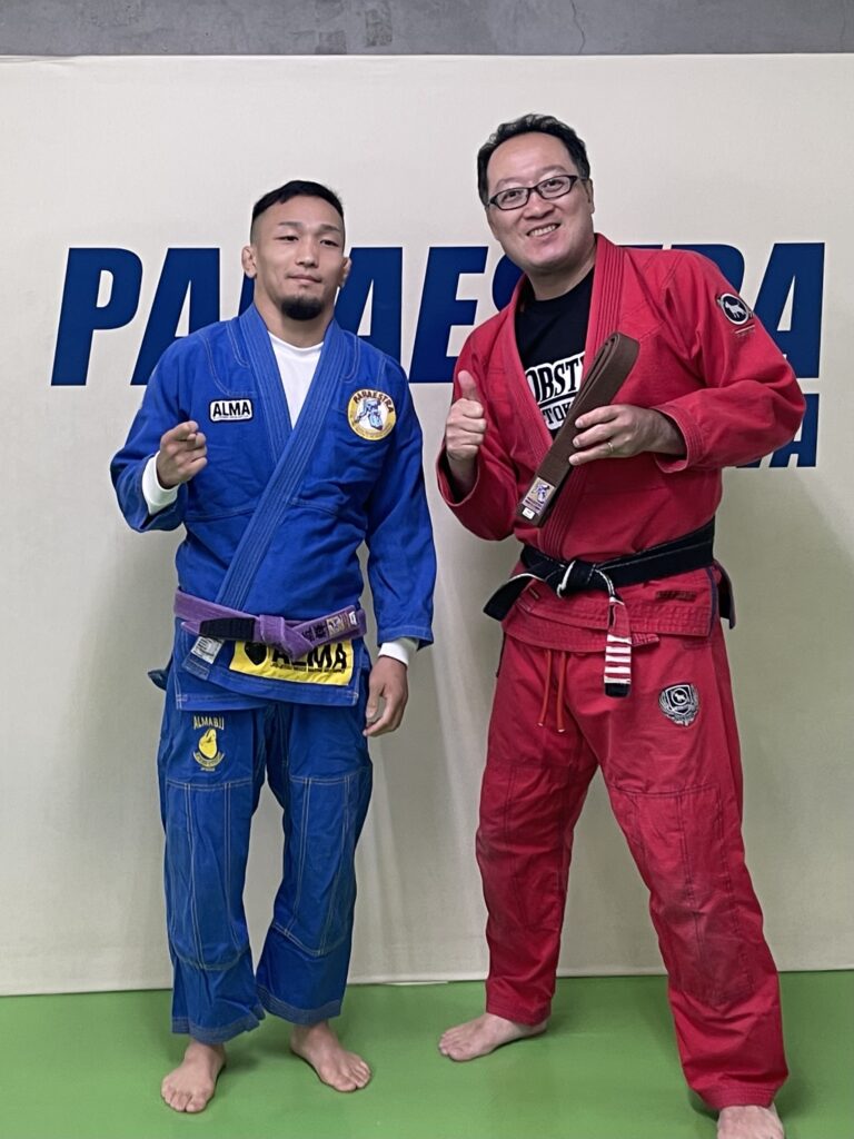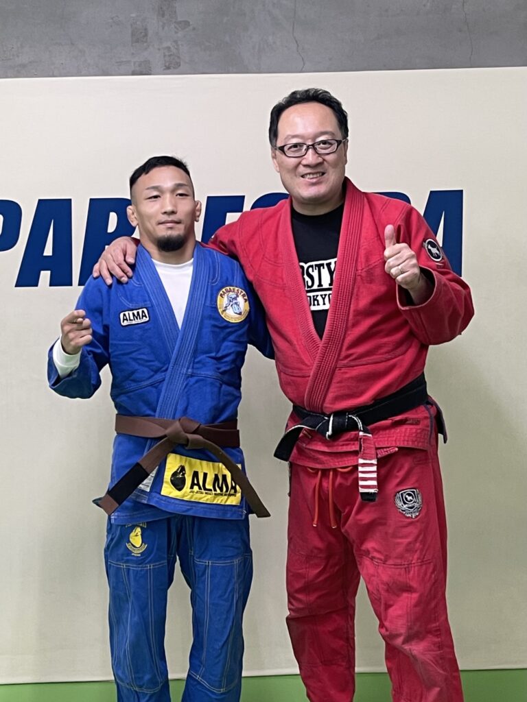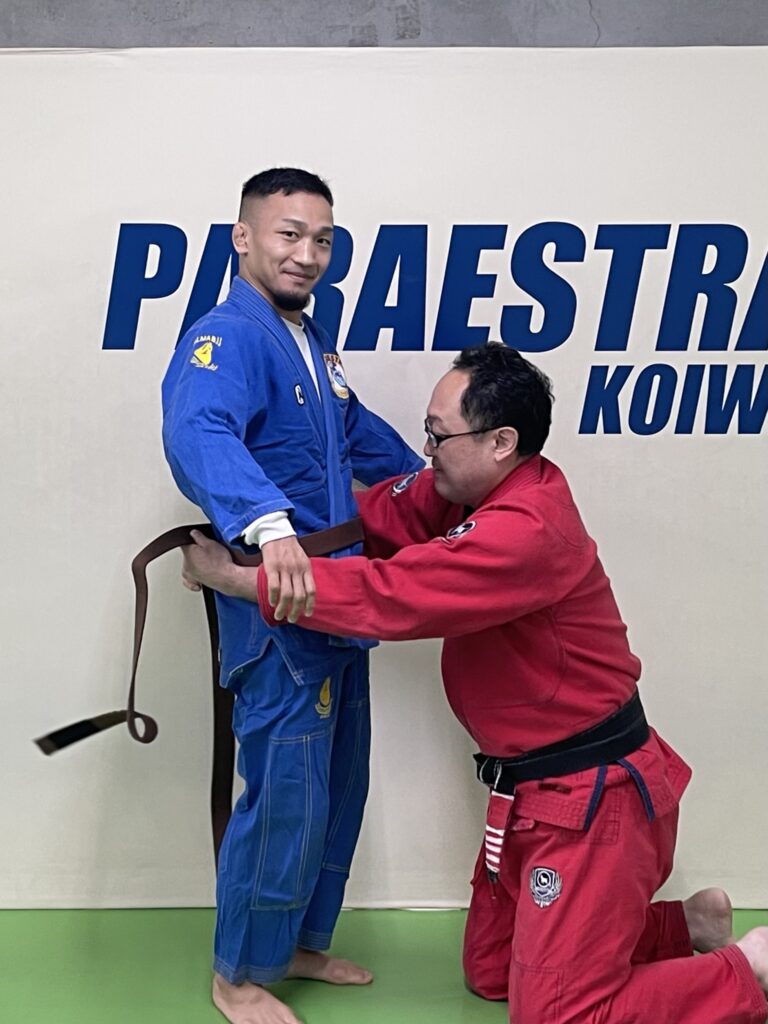 昨夜のパラエストラ小岩・MMAクラスにて、漆田君の腰に茶帯を巻きました。