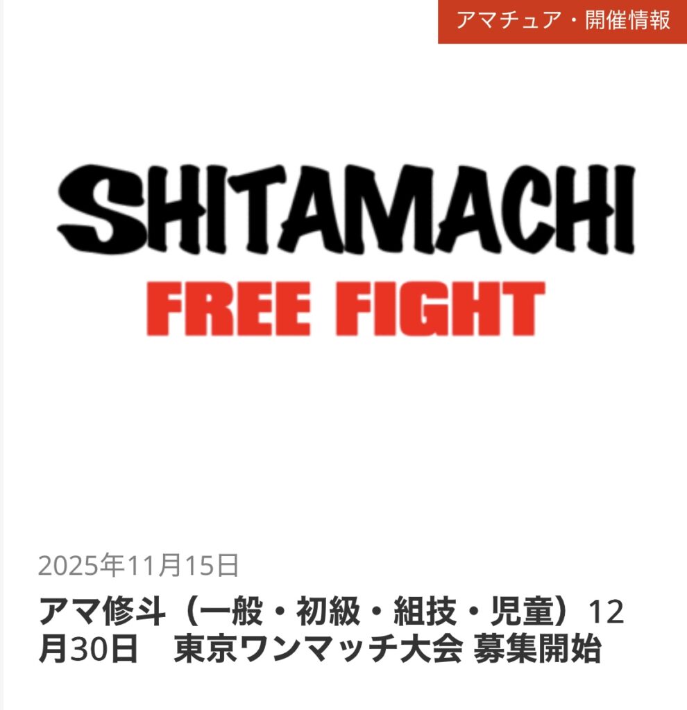 2025年最後のアマチュア修斗の大会である下町フリーファイト11を年末12/30(火)に綾瀬の東京武道館で開催いたします。アマチュア修斗、ビギナー修斗、キッズ・ジュニア修斗、修斗グラップリングの各カテゴリーで募集します。