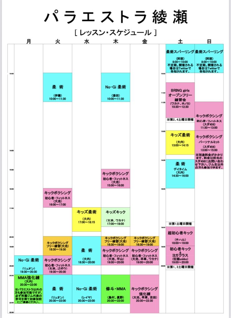 よっ子さんのキック&ヨガは第1、3土曜、チハルさんの超初心者キックは第1土曜です。金曜キック初心者は19時開始です。