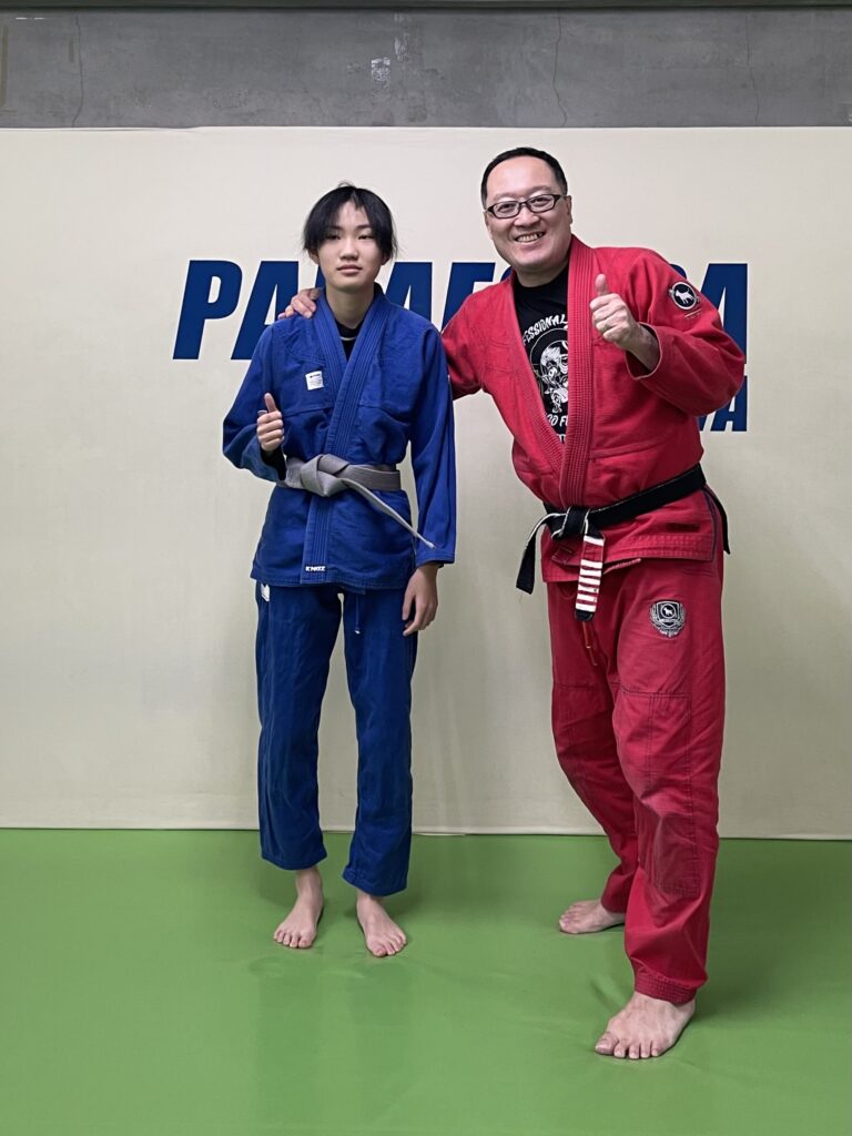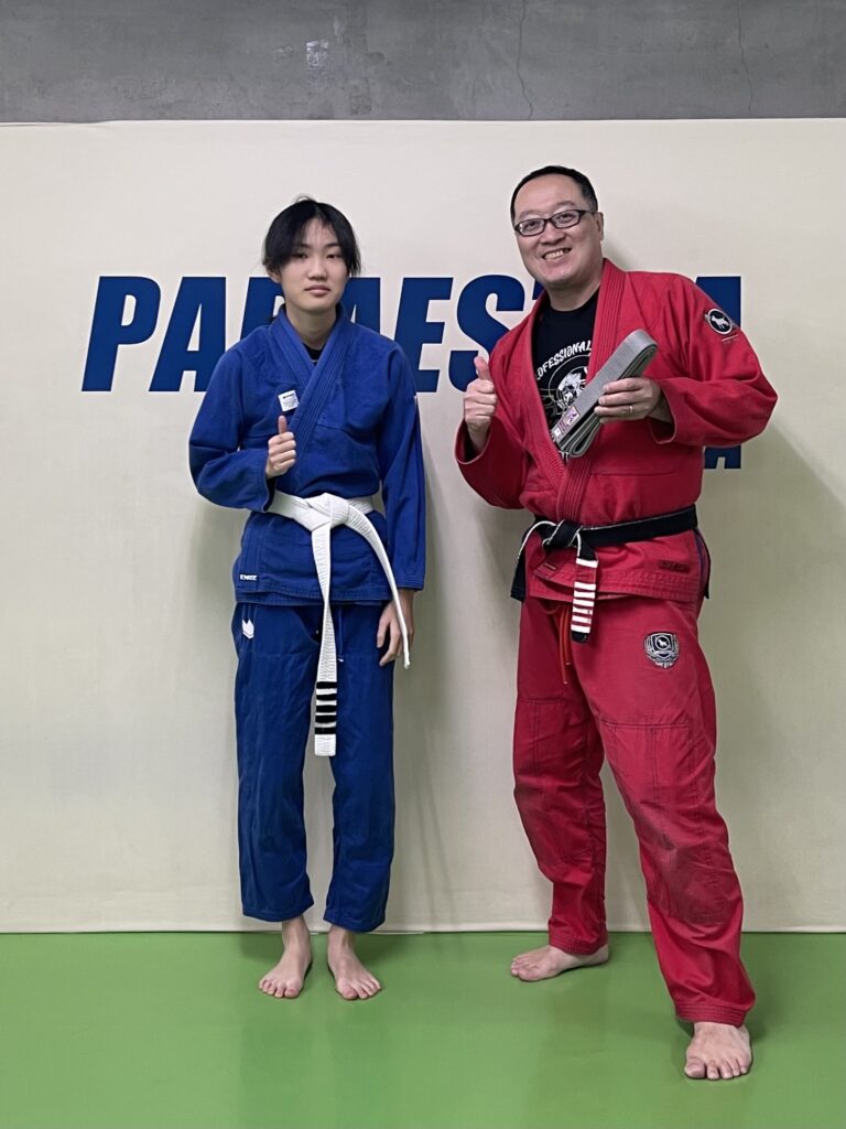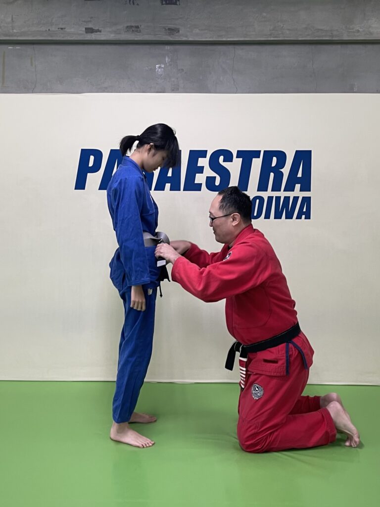 昨日のパラエストラ小岩・キッズ柔術にてナナの腰に灰帯を巻きました。