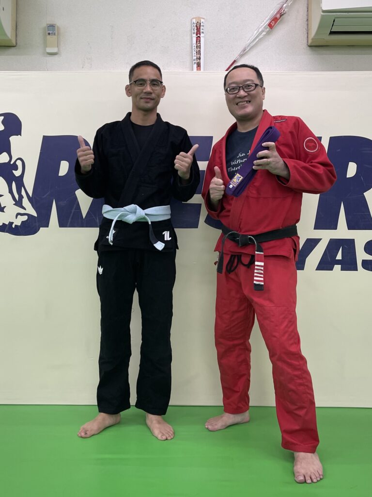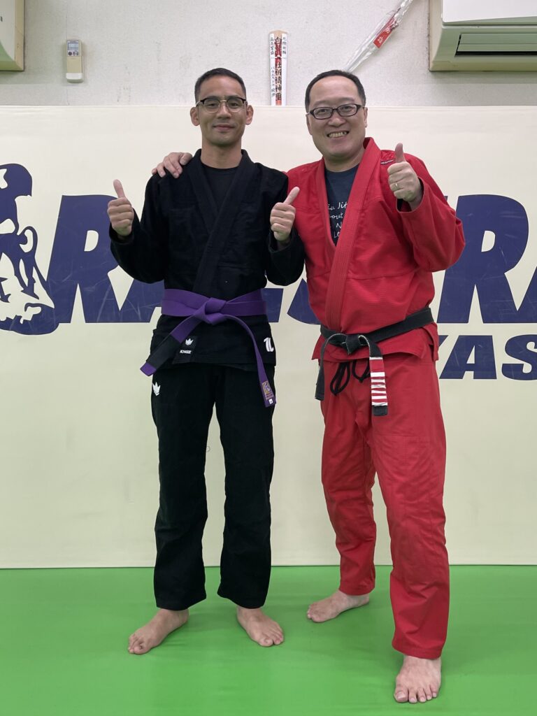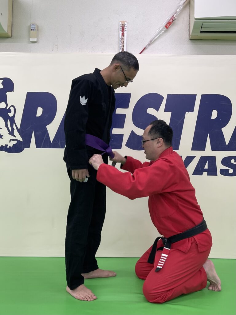 昨日のパラエストラ綾瀬・柔術クラスにて金城君の腰に紫帯を巻きました。