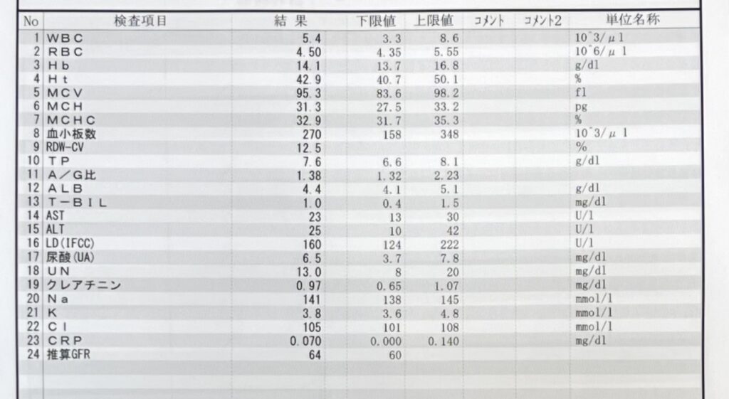 前回10月は全数値クリアでしたが今回は赤血球、ヘモグロビン関係の数値だけが再び少し低値に。最近忙しかったので疲労が原因かな?