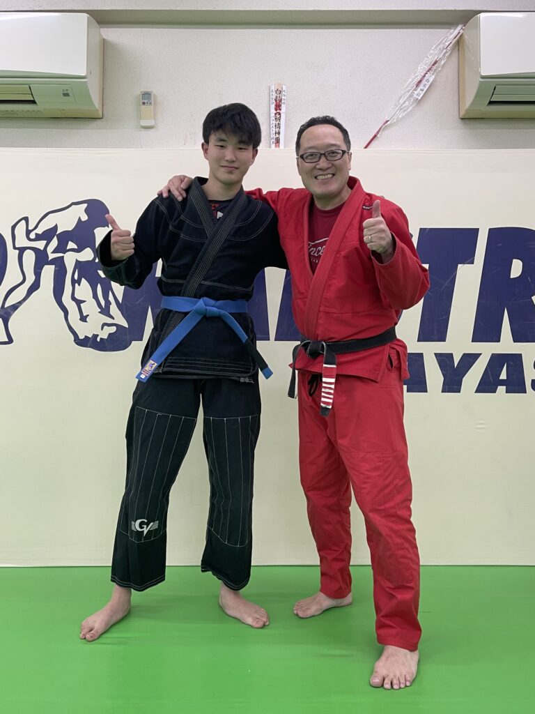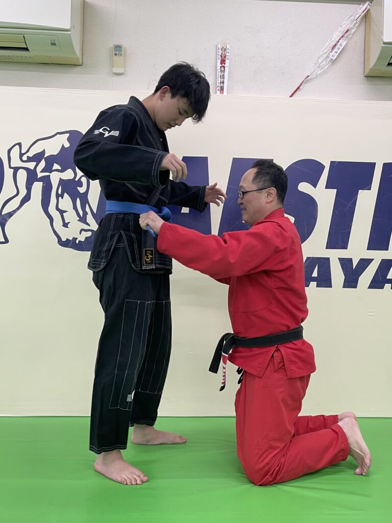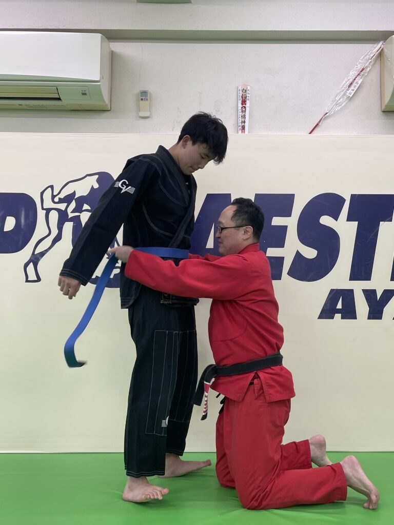 昨夜のパラエストラ綾瀬・柔術クラスにてユウガの腰に青帯を巻きました。