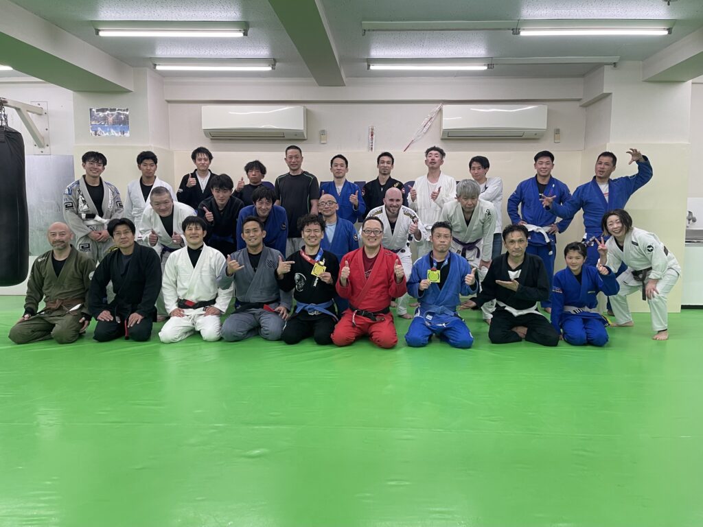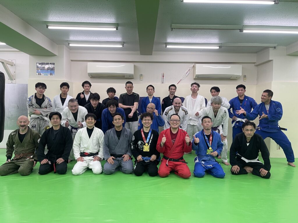 先日のTOKYO INTERNATIONAL SPRING JIU JITSU CHAMPIONSHIP 2026で優勝した川上君と川田君が金メダルを持ってきてくれたので、練習後皆で記念撮影。