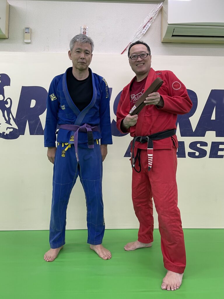 昨夜のパラエストラ綾瀬・柔術クラスにて小林君の腰に茶帯を巻きました。