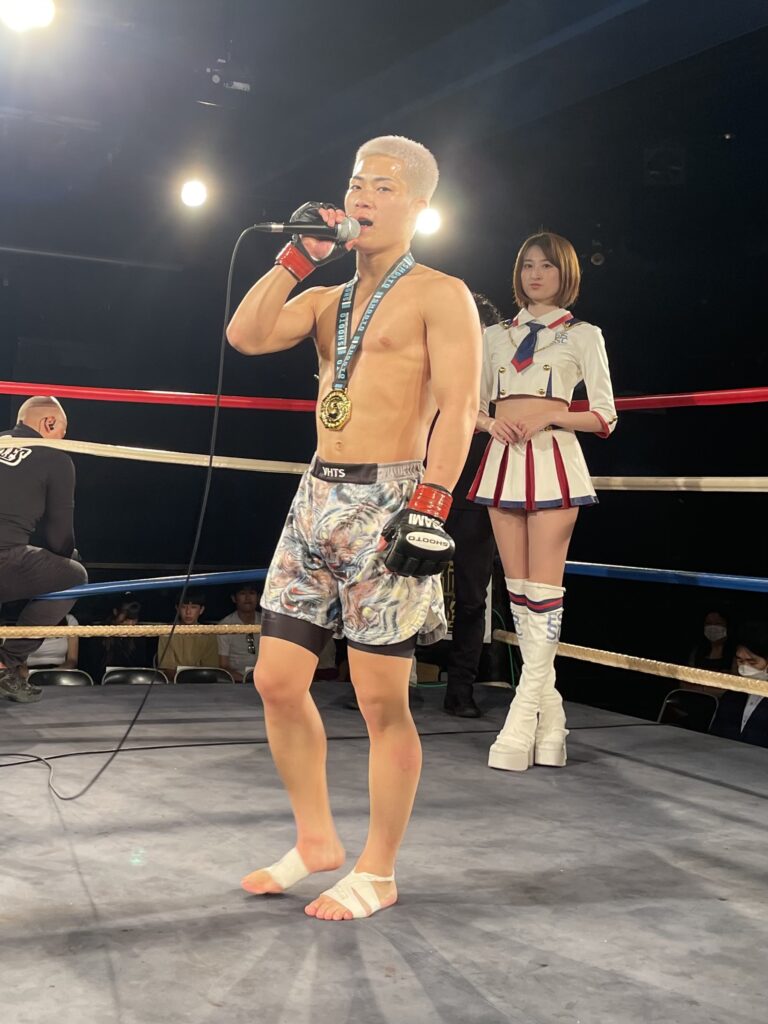 松宮君、立ち上がり良いコンビネーションで打撃を当てるもテイクダウンされ1R終了間際に肩固めで落ちTS負け